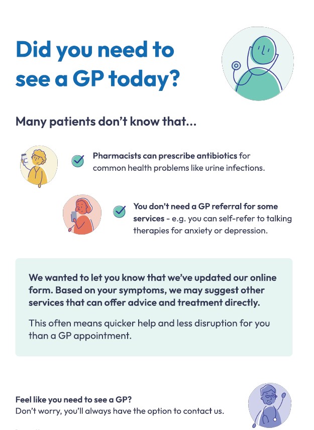 When you submit an online GP request through our website or the NHS App, you may be offered suggestions about other NHS services that can offer direct advice or treatment.